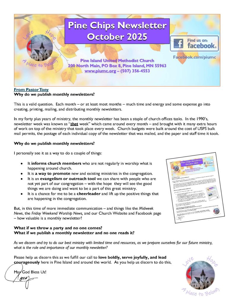 Your copy of our monthly Pine Chips Newsletter is available online or to be picked up in church!